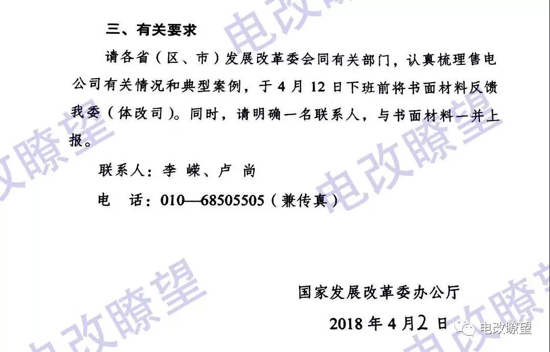 據(jù)電改瞭望微信號,國家發(fā)改委辦公廳日前發(fā)布了《關(guān)于請?zhí)峁┦垭姽居嘘P(guān)情況的函》,要求提供在本省電力交易中心注冊的售電公司共有多少家?2017年交易量是多少?售電公司不能在電力交易中心自主注冊或無法開展售電業(yè)務(wù)的,需說明原因,并提出落實改革要求的具體措施和時間表。