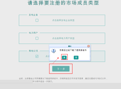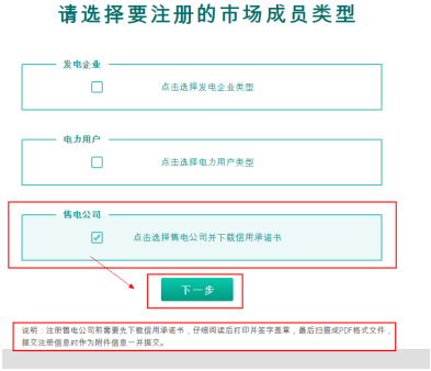 選擇售電公司類型,下載信用承諾書。注冊售電公司前需要先下載信用承諾書,仔細閱讀后打印并簽字蓋章,最后掃描成PDF格式文件,提交注冊信息時作為附件信息一并提交。