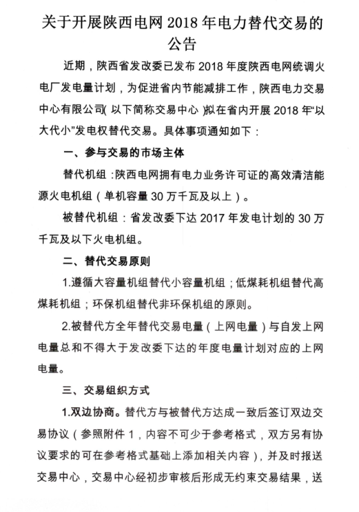 陜西電力交易中心日前發(fā)布了《關(guān)于開(kāi)展陜西電網(wǎng)2018年電力替代交易的公告》,擬在省內(nèi)開(kāi)展2018年以大代小發(fā)電權(quán)替代交易。替代機(jī)組為陜西電
