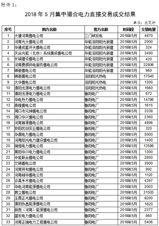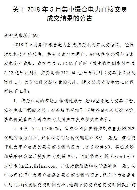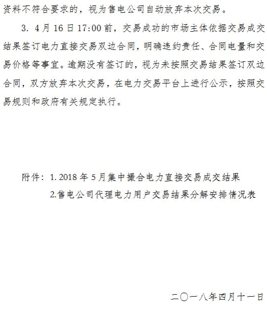 關(guān)于2018年5月集中撮合電力直接交易成交結(jié)果的公告》