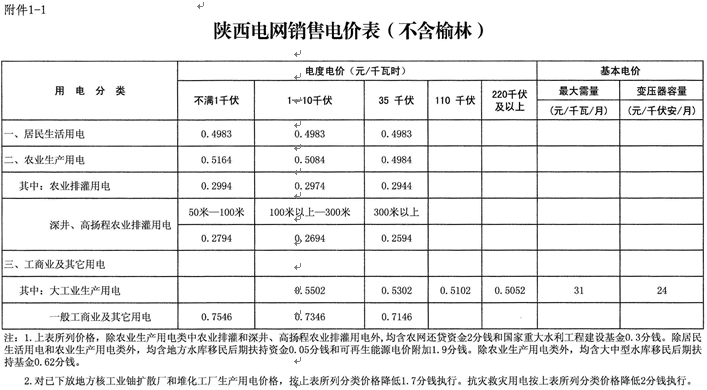 附件:1.陜西電網銷售電價表(不含榆林)