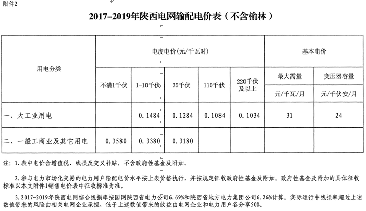 2.2017-2019年陜西電網輸配電價表(不含榆林)