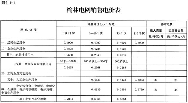 附件:1.榆林電網銷售電價表