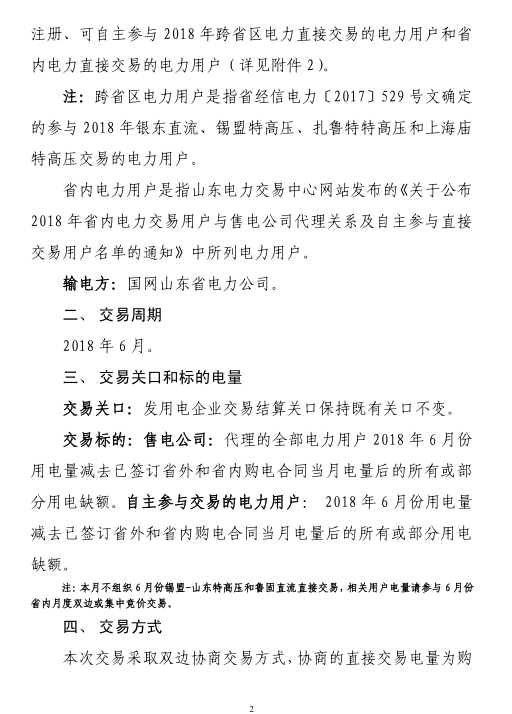 山東電力交易中心日前發(fā)布了《山東省2018年6月份電力直接交易(雙邊協(xié)商)公告,交易標(biāo)的:售電公司,代理的全部電力用戶2018年6月份用電量減去已簽訂省外和省內(nèi)購(gòu)電合同當(dāng)月電量后的所有或部分用電缺額。自主參與交易的電力用戶:2018年6月份用電量減去已簽訂省外和省內(nèi)購(gòu)電合同當(dāng)月電量后的所有或部分用電缺額。