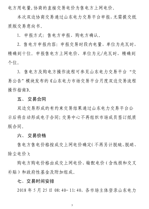 交易時(shí)間:2018年5月25日8:40-11:40,各市場(chǎng)主體登錄山東電力交易平臺(tái)申報(bào)并確認(rèn)相關(guān)電量、電價(jià)信息。