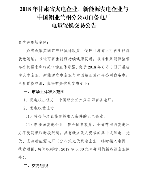 甘肅電力交易中心日前發(fā)布了《2018年蘭鋁自備電廠與火電、新能源發(fā)電企業(yè)發(fā)電權(quán)置換交易市場(chǎng)公告(4 6億)》,本次交易總電量為4 6億千瓦時(shí),