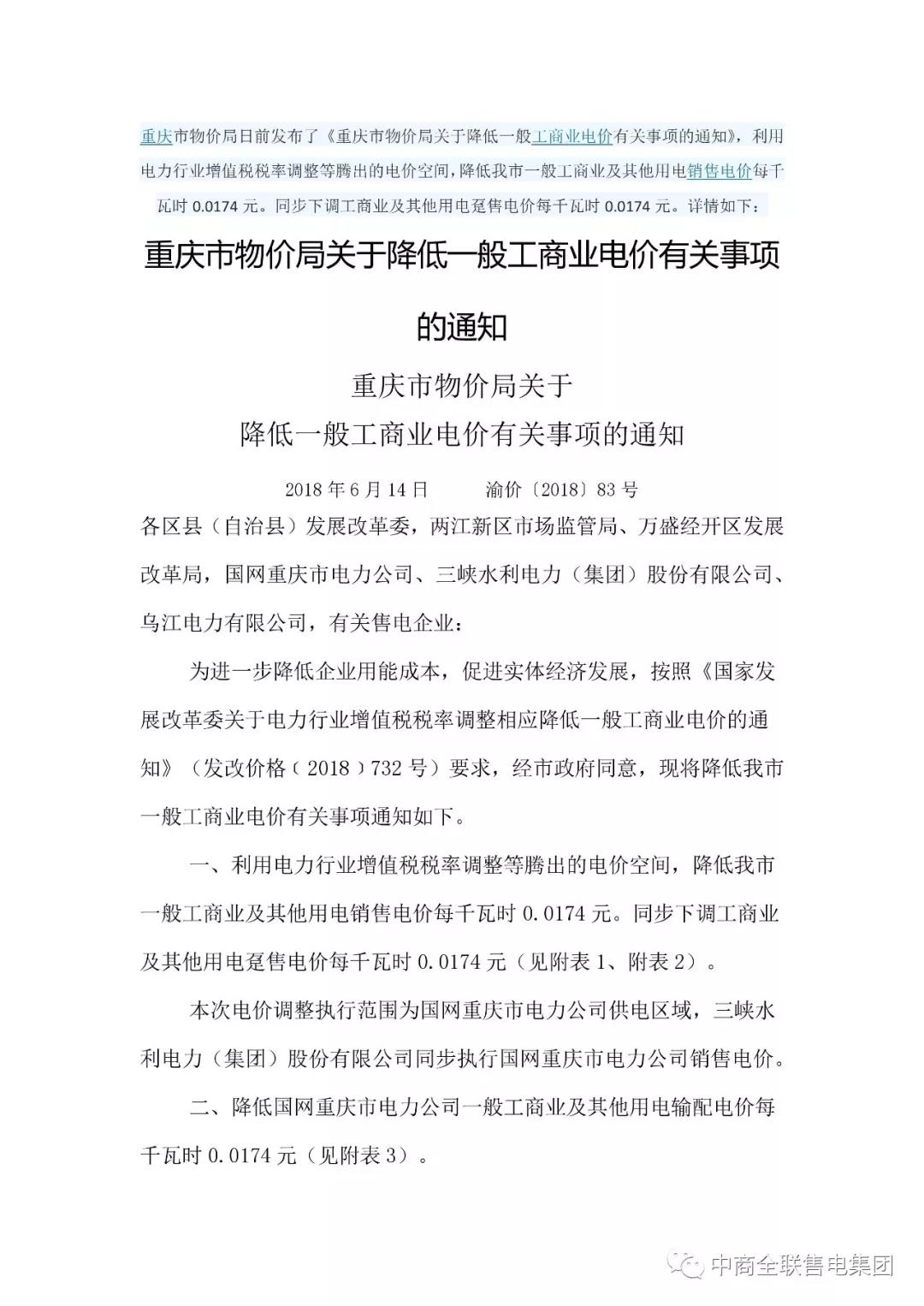 重慶市物價局發(fā)布了《關(guān)于降低一般工商業(yè)電價有關(guān)事項的通知》