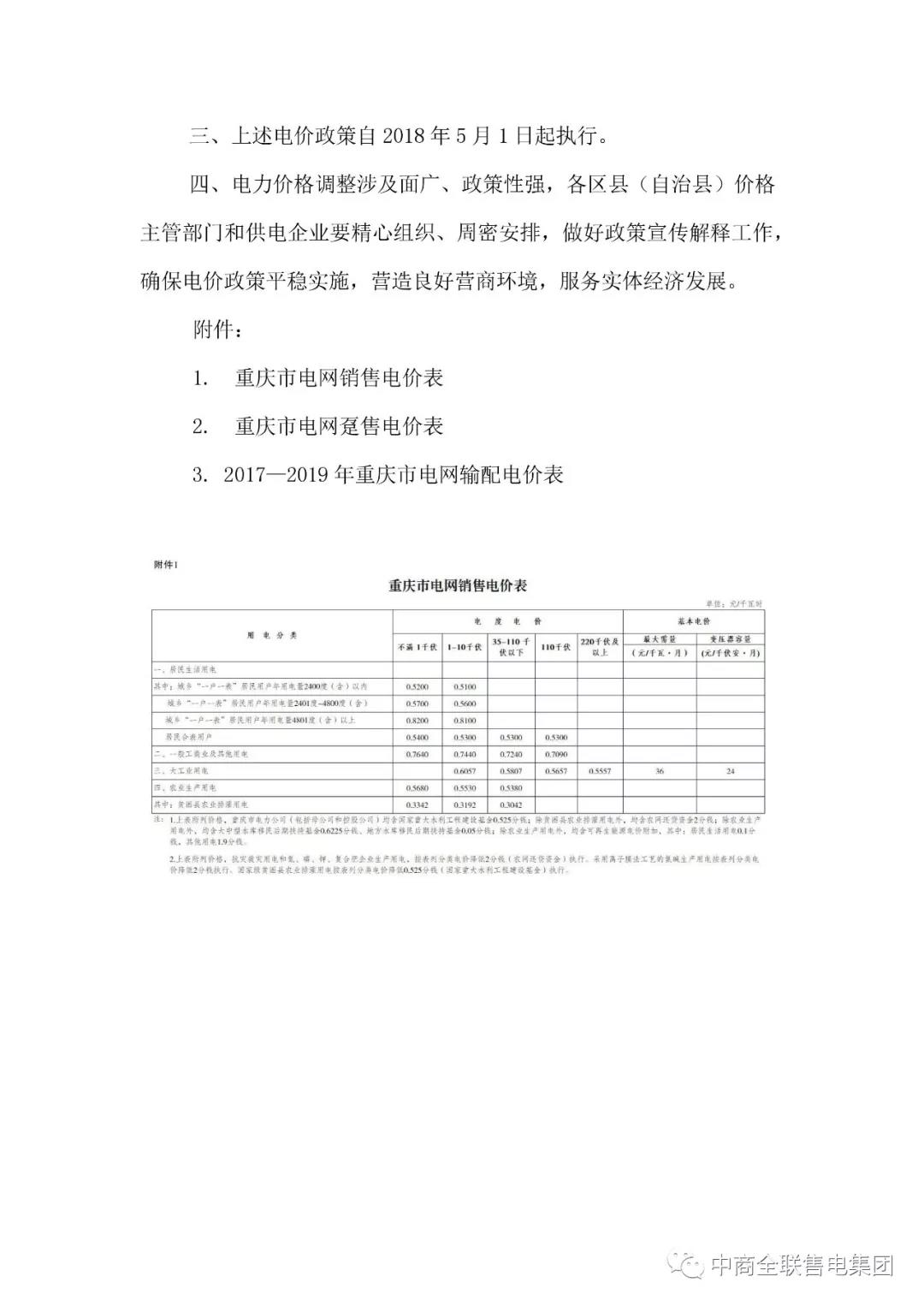 重慶市通過利用電力行業(yè)增值稅稅率調(diào)整等騰出的電價空間,降低該市一般工商業(yè)及其他用電銷售電價每千瓦時0.0174元,同步下調(diào)工商業(yè)及其它用電躉售電價每千瓦時0.0174元。同時,降低國網(wǎng)重慶市電力公司一般工商業(yè)及其他用電輸配電價每千瓦時0.0174元。