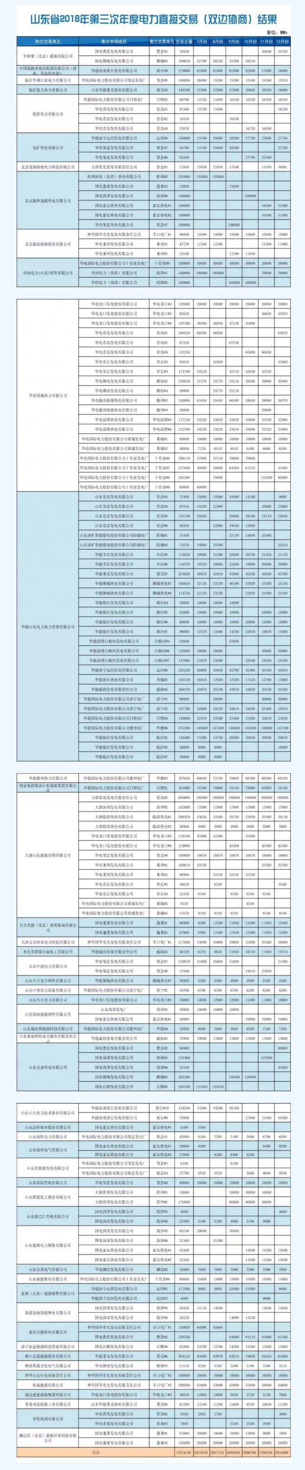 山東電力交易中心發(fā)布了《關(guān)于發(fā)布山東省2018年第三次年度電力直接交易(雙邊協(xié)商)結(jié)果的公告》,41家統(tǒng)調(diào)發(fā)電企業(yè)(92臺發(fā)電機(jī)組)與7家電力