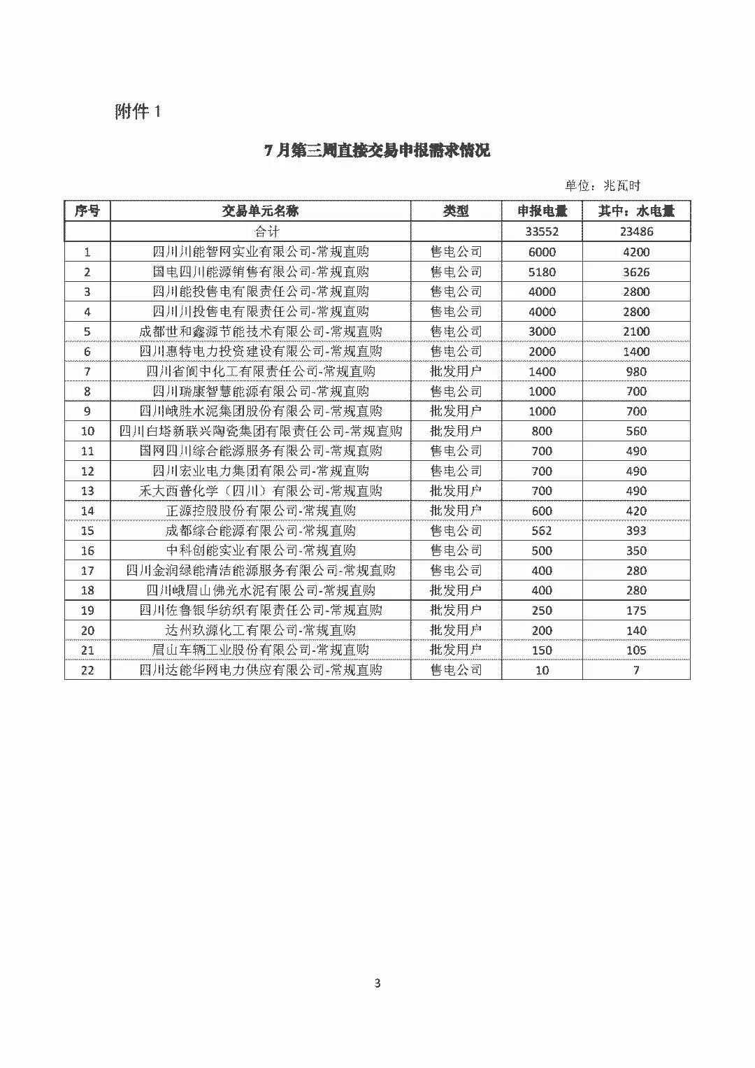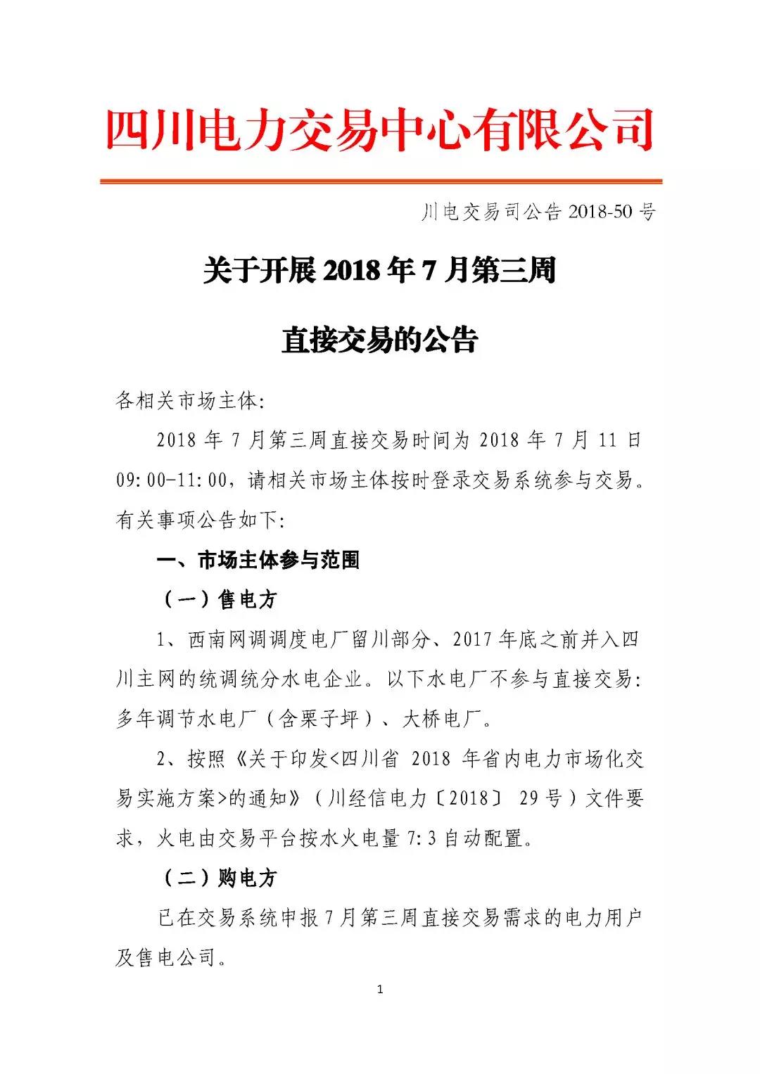 四川關(guān)于開展2018年7月第三周直接交易的公告