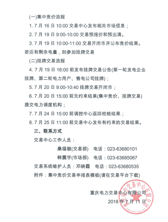 重慶2018年8月直接交易(集中交易)擬于7月19日展開