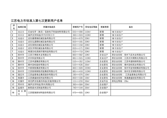 江蘇電力交易中心日前發(fā)布了《關(guān)于2018年江蘇電力市場(chǎng)準(zhǔn)入用戶名單第七次更新的公告》,共19家電力用戶獲準(zhǔn)入。詳情如下: