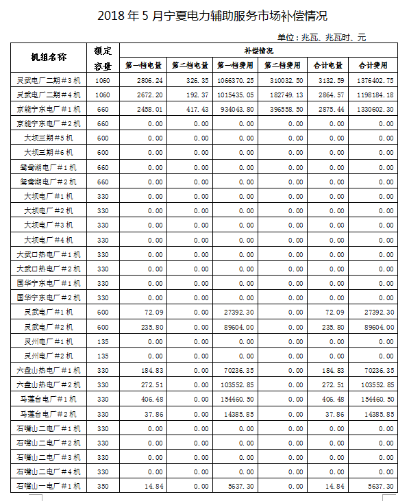 關(guān)于公布2018年5月份寧夏電力輔助服務(wù)市場(chǎng)補(bǔ)償分?jǐn)偳闆r的通知