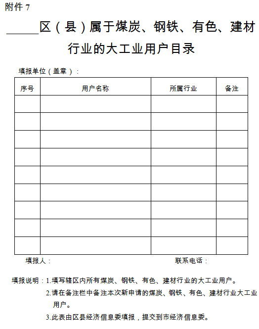 5.轄區(qū)內(nèi)屬于煤炭、鋼鐵、有色、建材行業(yè)的大工業(yè)用戶目錄(見附件7);