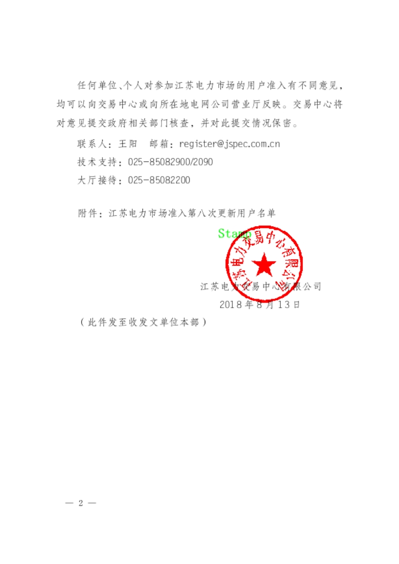 江蘇電力交易中心日前發(fā)布了《關于2018年江蘇電力市場準入用戶名單第八次更新的公告》,新增3家電力用戶,7家電力用戶更名,7家電力用戶過戶,4家電力用戶升壓,4家電力用戶銷戶。