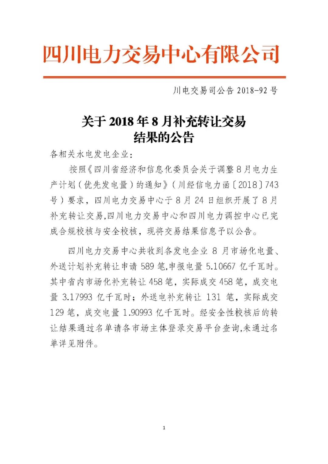 四川電力交易中心于8月24日組織開(kāi)展了8月補(bǔ)充轉(zhuǎn)讓交易,四川電力交易中心和四川電力調(diào)控中心已完成合規(guī)校核與安全校核,現(xiàn)將交易結(jié)果信息予