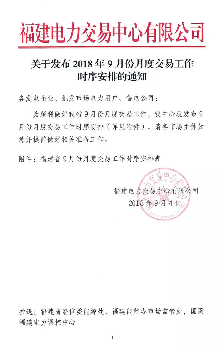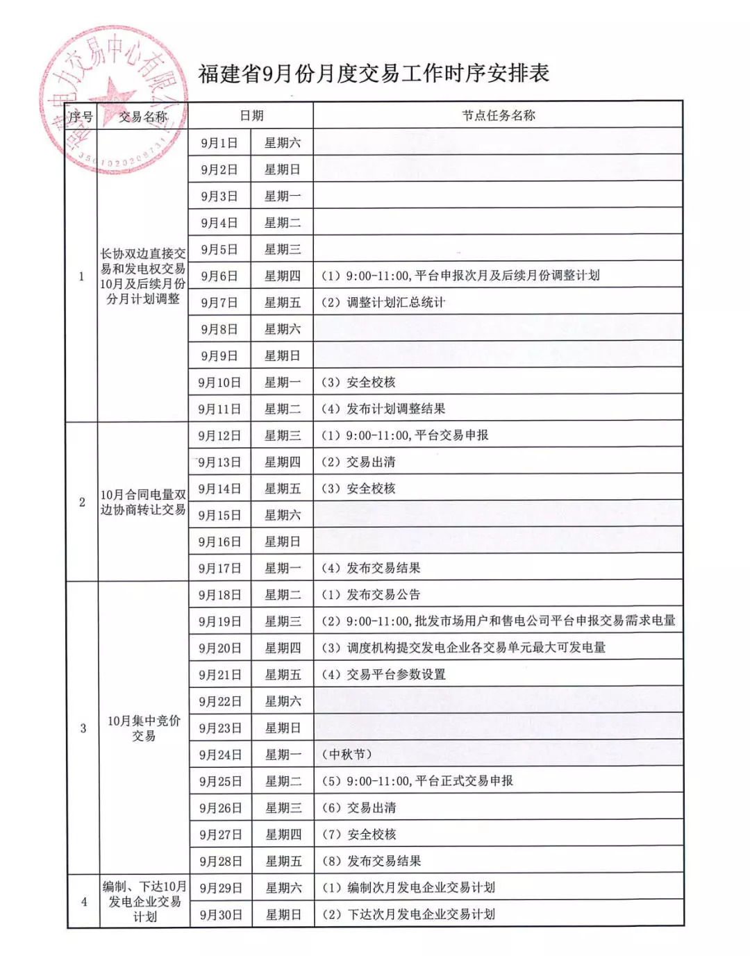 福建2018年9月份月度交易時(shí)間安排