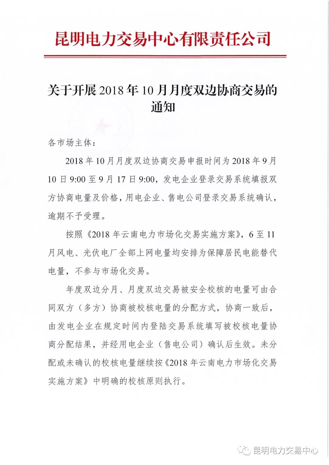 云南關(guān)于開展2018年10月月度雙邊協(xié)商交易的通知