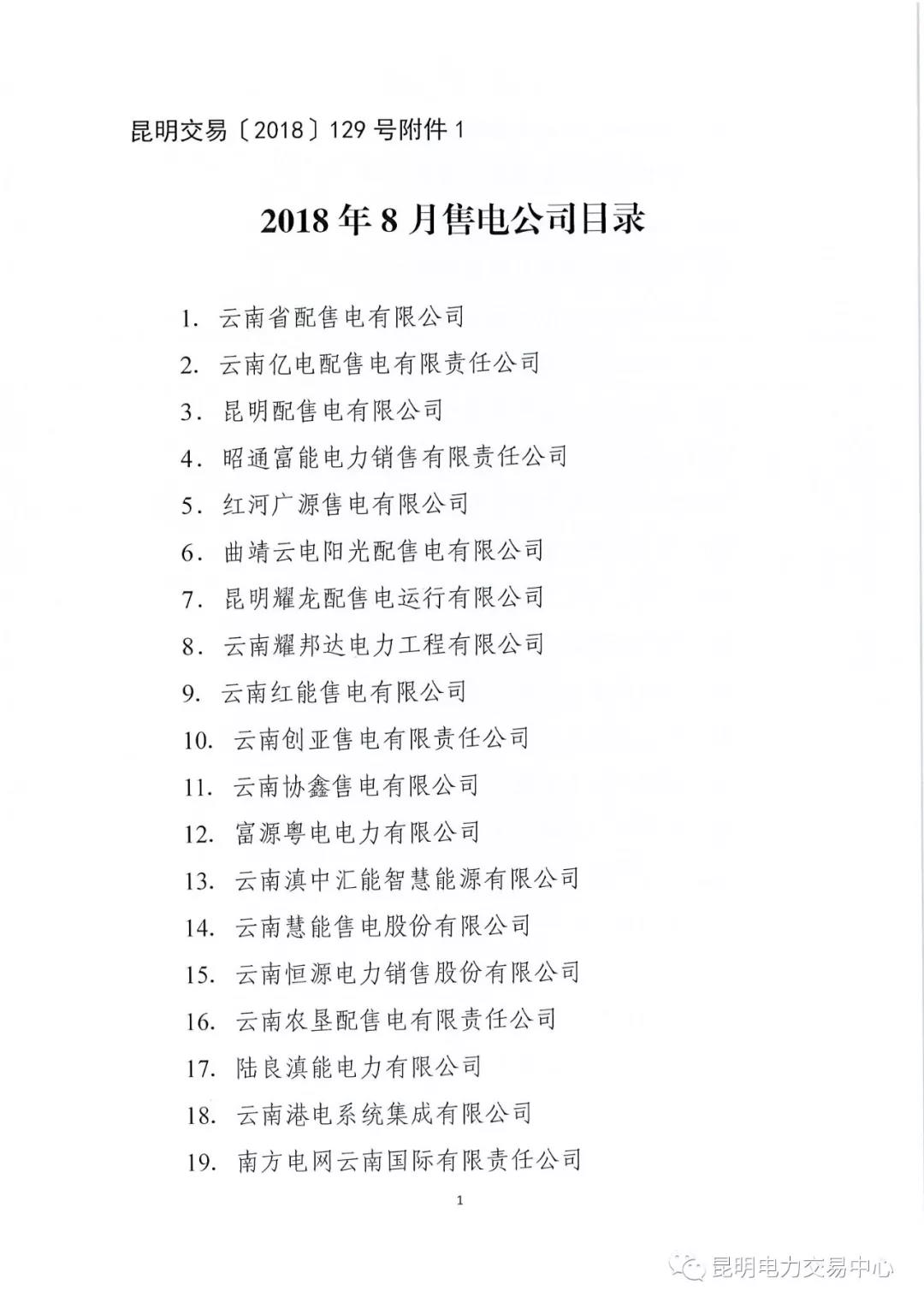 昆明電力交易中心關(guān)于公布2018年8月售電企業(yè)目錄的通知