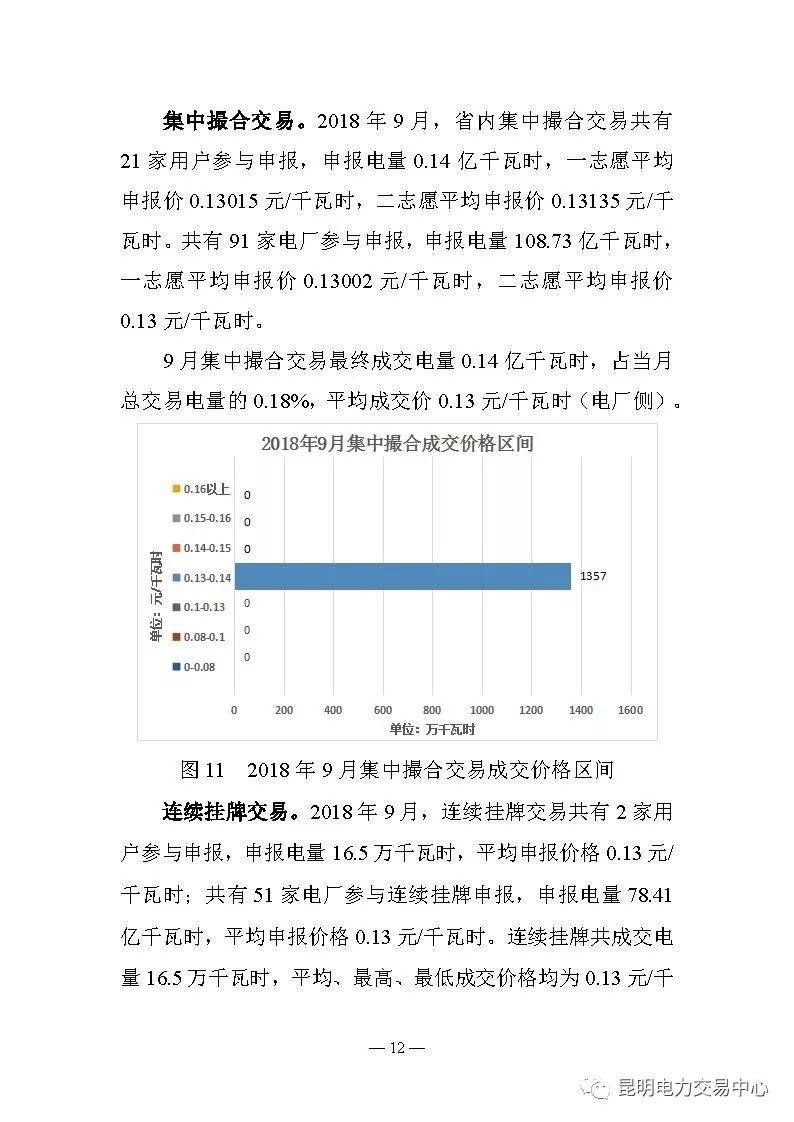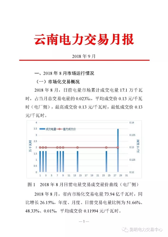 昆明電力交易中心日前發(fā)布了《云南電力交易月報(2018年9月)》,2018年8月,日前電量市場累計成交電量17 1萬千瓦時,占當(dāng)月總交易電量的0 023%,平均成交價0 13元 千瓦時(電廠側(cè)),最高成交價0 13元 千瓦時,最低成交價0 13元 千瓦時。