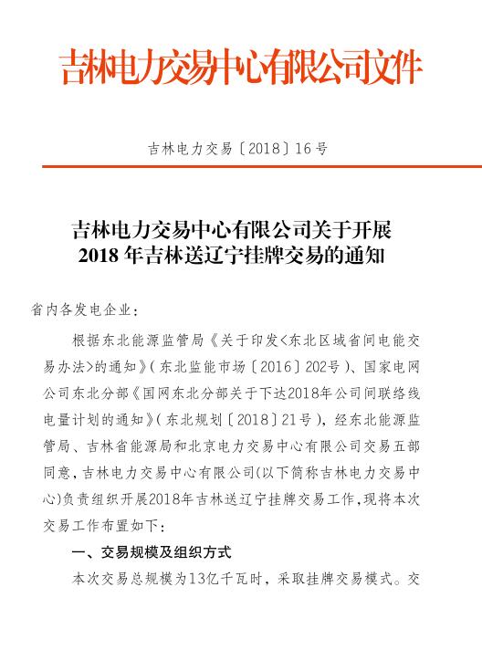 2018年吉林送遼寧掛牌交易:總規(guī)模13億千瓦時