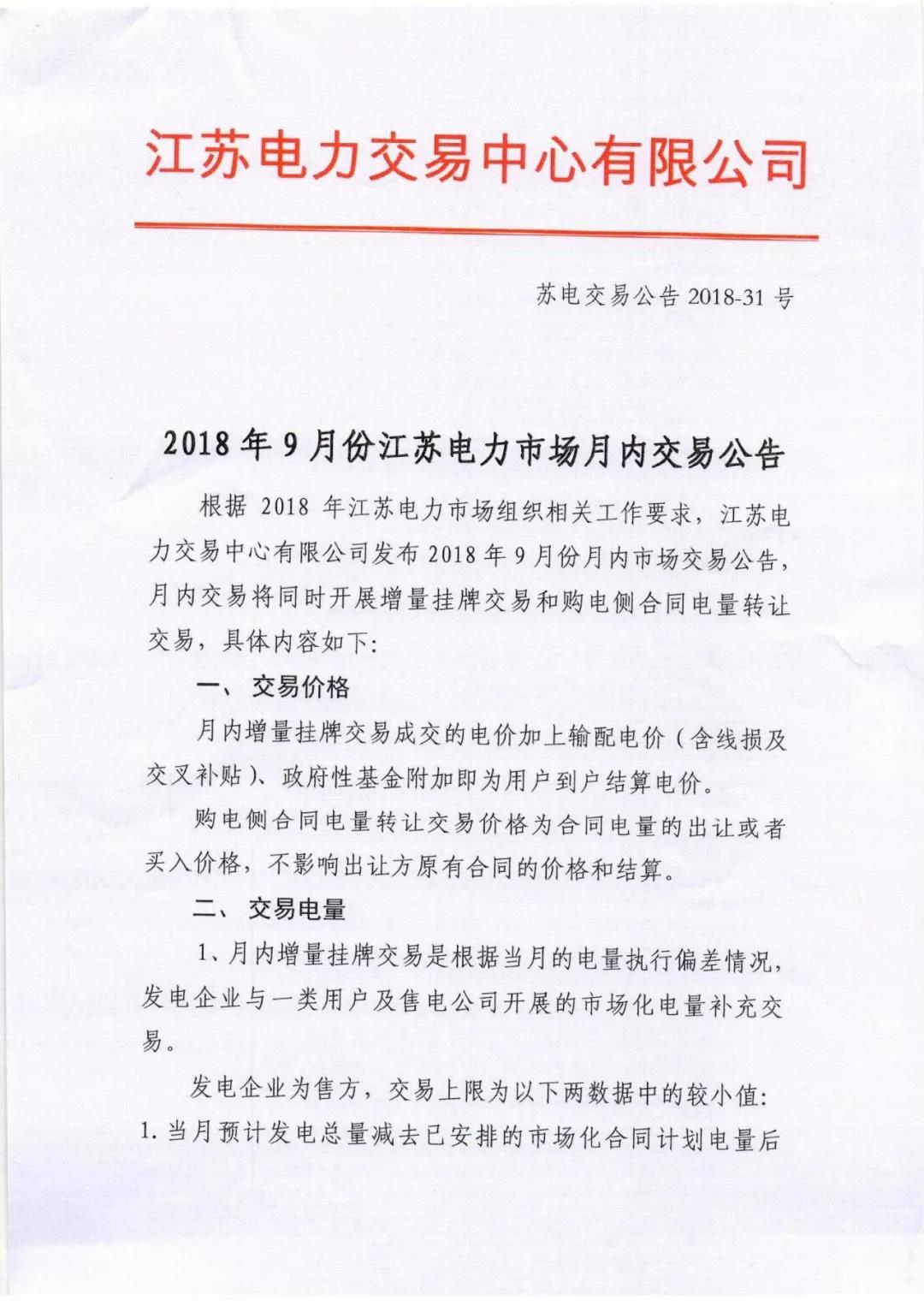 2018年9月份江蘇電力市場(chǎng)月內(nèi)交易公告