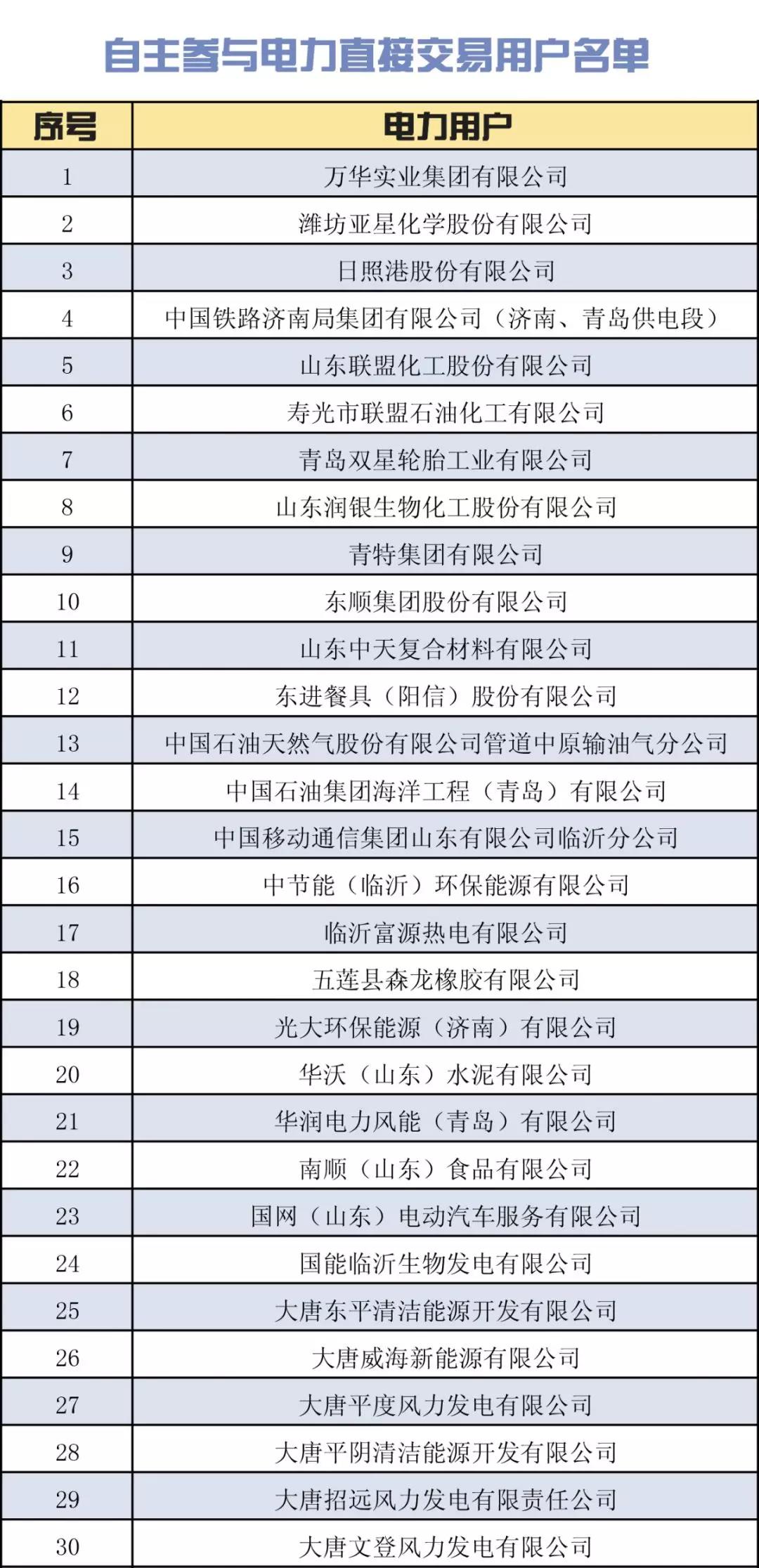 購電方:在山東電力交易中心網(wǎng)站公示通過、完成注冊且已提交有效2018年跨省區(qū)電力用戶代理協(xié)議、省內(nèi)電力用戶代理協(xié)議的售電公司;省經(jīng)信委準許并在山東電力交易中心網(wǎng)站完成注冊、可自主參與2018年跨省區(qū)電力直接交易的電力用戶和省內(nèi)電力直接交易的電力用戶(詳見下表)。