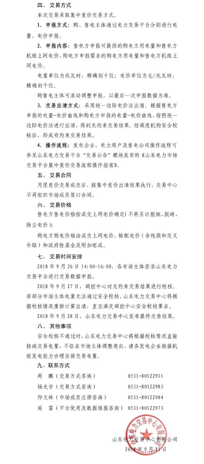 山東省2018年10月份電力直接交易 (集中競價)公告