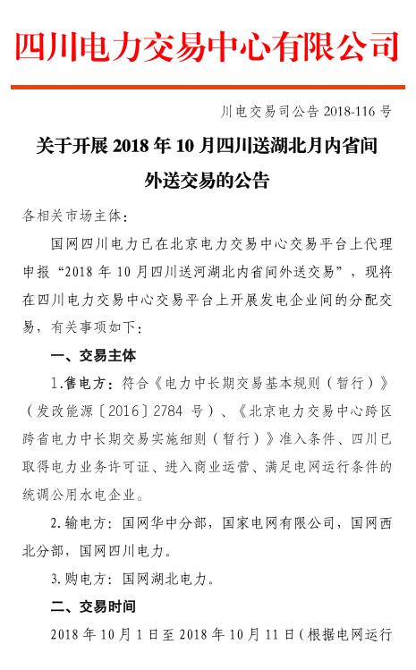 2018年10月四川送湖北月內(nèi)省間外送交易:交易電量0.25億千瓦時