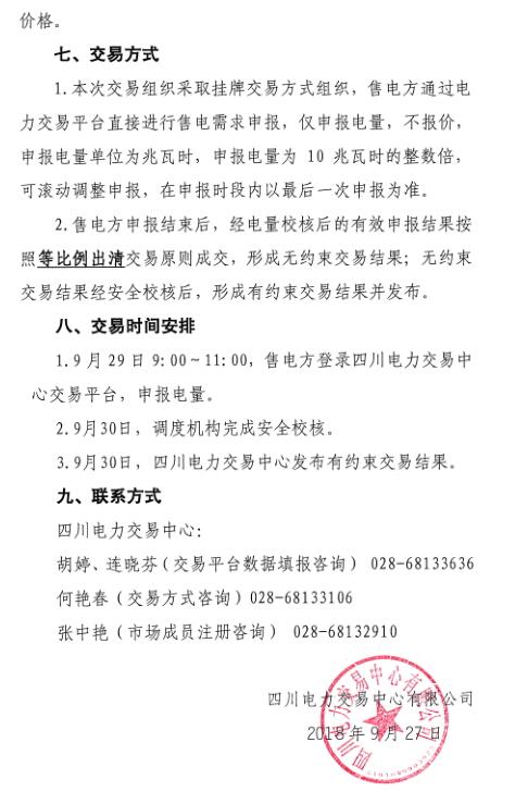 四川電力交易中心日前發(fā)布了《關(guān)于開展2018年10月四川送湖北月內(nèi)省間外送交易的公告》, 本次交易組織釆取掛牌交易方式組織,德寶直流通道四川側(cè)交易電量:0 25億千瓦時。交易時間為2018 年10月1日至2018年10月11日(根據(jù)電網(wǎng)運(yùn)行情況調(diào)整)。
