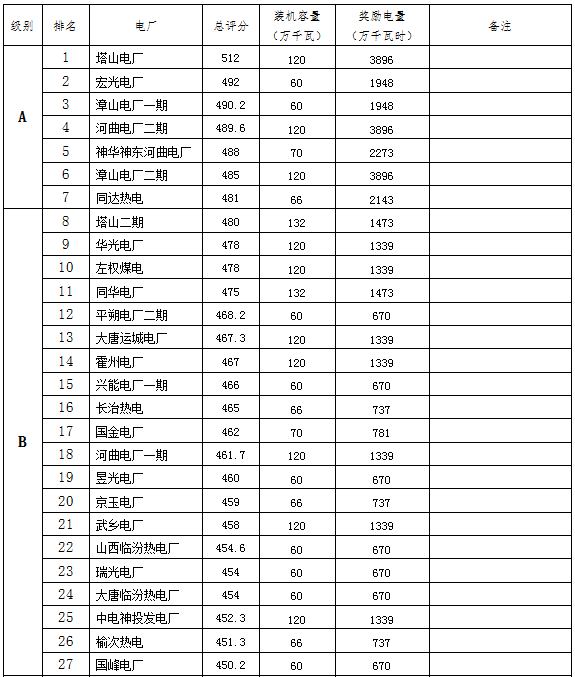 在每個(gè)獎(jiǎng)勵(lì)周期內(nèi),由省電力調(diào)度控制中心對(duì)本周期內(nèi)省調(diào)火電燃煤機(jī)組運(yùn)行情況進(jìn)行考核評(píng)分,按照經(jīng)公示無(wú)異議的最終評(píng)分結(jié)果,將參與考核評(píng)分的企業(yè)按總分劃分為A、B、C、D四個(gè)等級(jí),其中A級(jí)為排名前10%的企業(yè),B級(jí)為排名10%—40%的企業(yè),C級(jí)為排名40%—70%,D級(jí)為排名后30%的企業(yè),各級(jí)別企業(yè)個(gè)數(shù)均按四舍五入取整數(shù)。