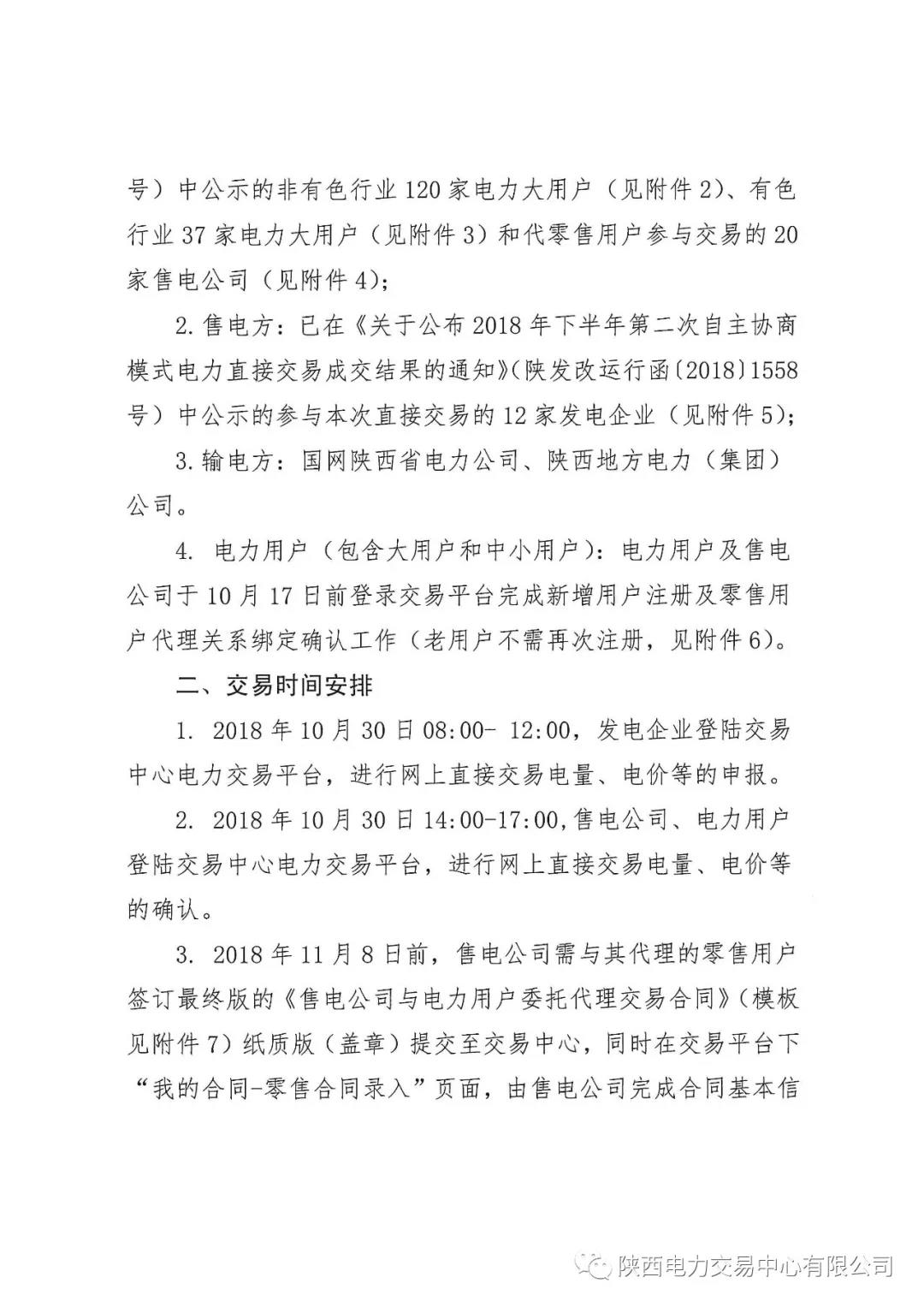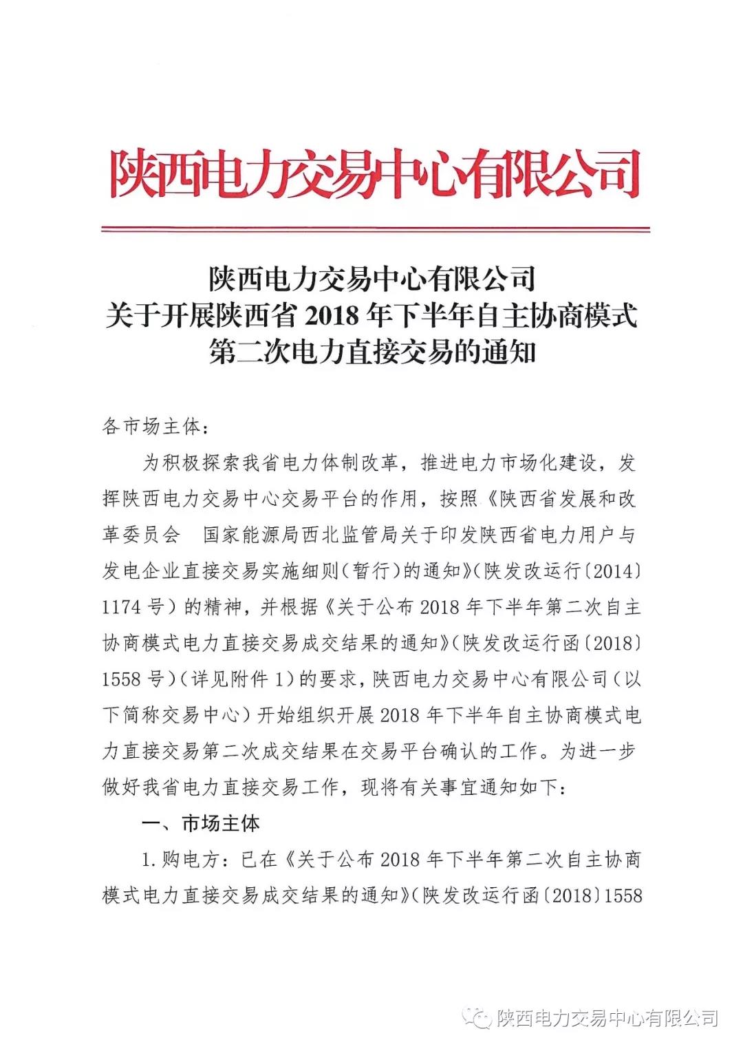 陜西電力交易中心有限公司關(guān)于開展陜西省2018年下半年自主協(xié)商模式第二次電力直接交易的通知