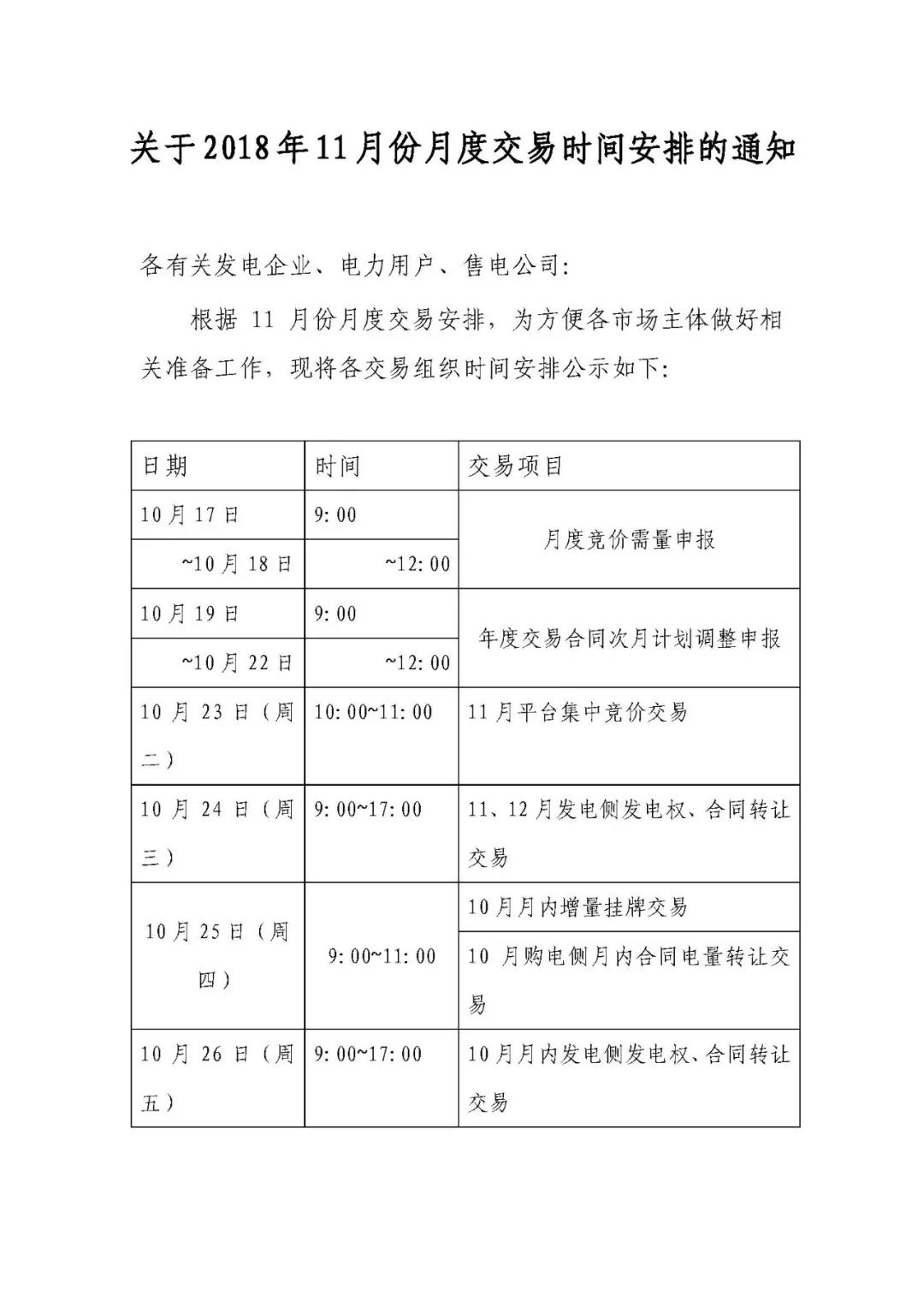 關(guān)于2018年11月份月度交易時間安排的通知