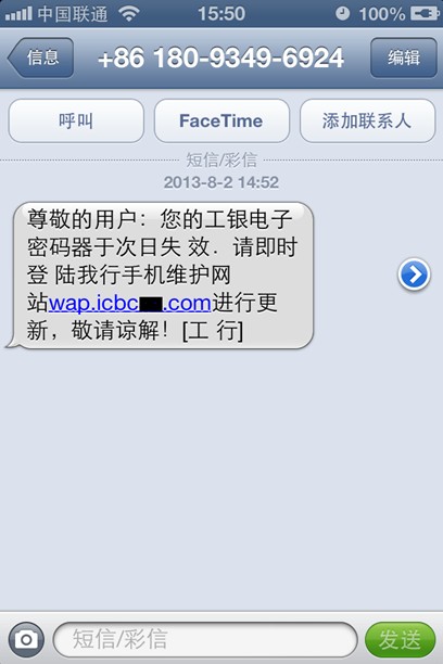 據(jù)介紹,“工行”詐騙短信主要以工行電子密碼器即將失效為借口,欺騙網(wǎng)友登錄其指定網(wǎng)址。實際上,據(jù)瑞星安全專家介紹,銀行提供的短信服務通常都使用短信平臺號碼,絕不可能是用普通手機號發(fā)送的。同時,短信中提到電子密碼器失效一事也不成立,電子密碼器只要沒有過期,就沒有失效的說法。如果電子密碼器真的過期,也只能通過工行專柜進行辦理,網(wǎng)上無法直接辦理。