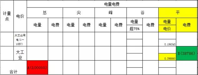 2、平電價(jià)里面購(gòu)電基準(zhǔn)價(jià)仍顯示0.39886,假設(shè)電量A合計(jì)為100000千瓦時(shí),優(yōu)惠電費(fèi)合計(jì)為0.011元/千瓦時(shí)。算法為表格中電量電費(fèi)合計(jì)中紅框A內(nèi)數(shù)值*購(gòu)電基準(zhǔn)價(jià)-綠色底B數(shù)據(jù)等于總優(yōu)惠金額。