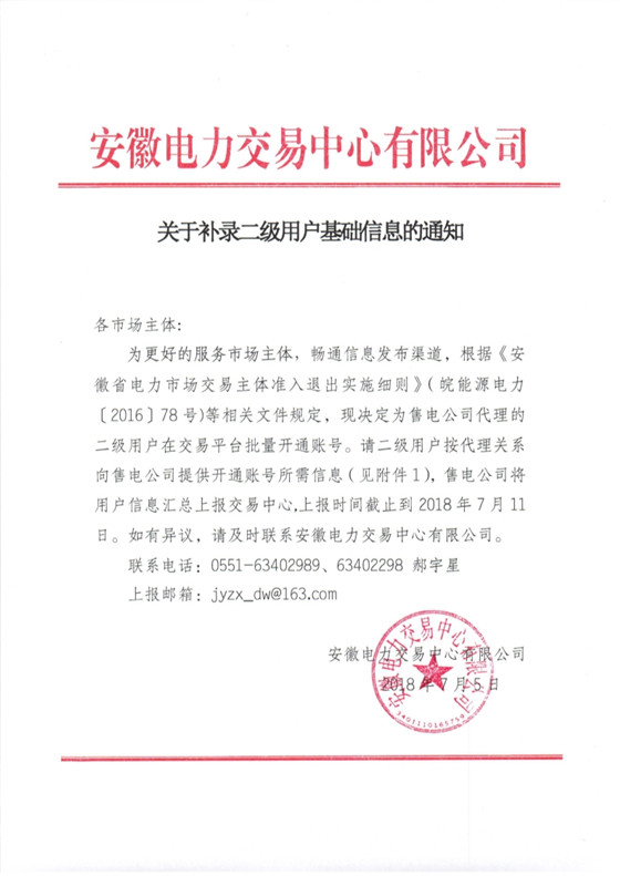 安徽電力交易中心日前發(fā)布了《關(guān)于補(bǔ)錄二級用戶基礎(chǔ)信息的通知》,為售電公司代理的二級用戶在交易平臺批量開通賬號。詳情如下: