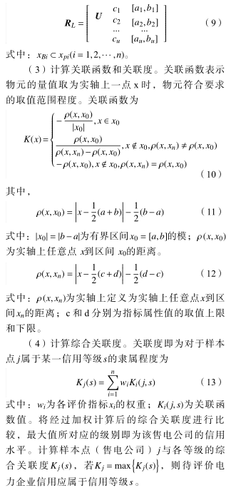 目前,國內(nèi)電力市場(chǎng)主體信用評(píng)價(jià)的研究對(duì)象主要是電力用戶 [1-2] ,尚無針對(duì)售電公司的信用評(píng)價(jià)研究,但評(píng)價(jià)模型是通用的,可以通過其他主體信用評(píng)價(jià)指標(biāo)和方法,進(jìn)而構(gòu)建售電公司信用評(píng)價(jià)模型?,F(xiàn)行的主要評(píng)價(jià)方法有模糊綜合評(píng)價(jià) [3] 、理想解法 [4] 等,但上述方法無法解決評(píng)價(jià)信息重復(fù)或計(jì)算過程復(fù)雜等問題,物元可拓 (matter-element extension, MEE) 理論能夠兼顧不確定性和模糊性,又能體現(xiàn)出評(píng)價(jià)指標(biāo)對(duì)兩級(jí)級(jí)別的差異及統(tǒng)一級(jí)別內(nèi)部的不同狀態(tài),已經(jīng)應(yīng)用到了產(chǎn)品質(zhì)量評(píng)價(jià) [5] 和產(chǎn)業(yè)安全評(píng)價(jià) [6] 等領(lǐng)域,并取得較好的評(píng)價(jià)效果。因此,本文嘗試將物元可拓評(píng)價(jià)方法運(yùn)用到售電公司信用評(píng)價(jià)研究中,但售電公司信用評(píng)價(jià)指標(biāo)之間存在多重相關(guān)性,冗余指標(biāo)數(shù)據(jù)會(huì)損害模型的仿真能力,直接運(yùn)用物元可拓模型開展售電公司信用評(píng)價(jià)會(huì)產(chǎn)生一定誤差,因此,需要使用一種特征提取方法以準(zhǔn)確提取變量間的重要信息特征。同時(shí),原始數(shù)據(jù)中存在非線性屬性,采用傳統(tǒng)特征提取方法可能會(huì)出現(xiàn)較大偏差,核主成分分析 (kernel principal componentanalysis,KPCA) 是一種非線性主成分評(píng)價(jià)模型,能更有效地處理變量間的非線性關(guān)系,廣泛應(yīng)用于特征提取研究 [7] ,因此,本文將 KPCA 和 MEE相結(jié)合對(duì)售電公司進(jìn)行信用評(píng)價(jià)。