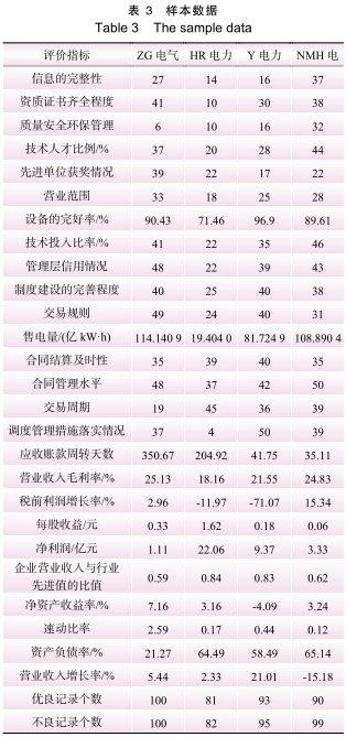 (1)樣本數(shù)據(jù)采集。以 4 家售電公司(分別為 ZG 電氣、HR 電力、Y 電力、NMH 電)經(jīng)處理后的運(yùn)營數(shù)據(jù)為樣本進(jìn)行算例實(shí)證分析,應(yīng)用上文所構(gòu)建的售電公司信用評(píng)價(jià)指標(biāo)體系,采用KPCA-MEE 模型進(jìn)行綜合評(píng)價(jià)。為保證模型適用性,樣本企業(yè)中包含了獨(dú)立的售電公司、由發(fā)電集團(tuán)企業(yè)內(nèi)部組建的售電公司等多種不同性質(zhì)的售電公司。具體數(shù)據(jù)如表 3 所示。
