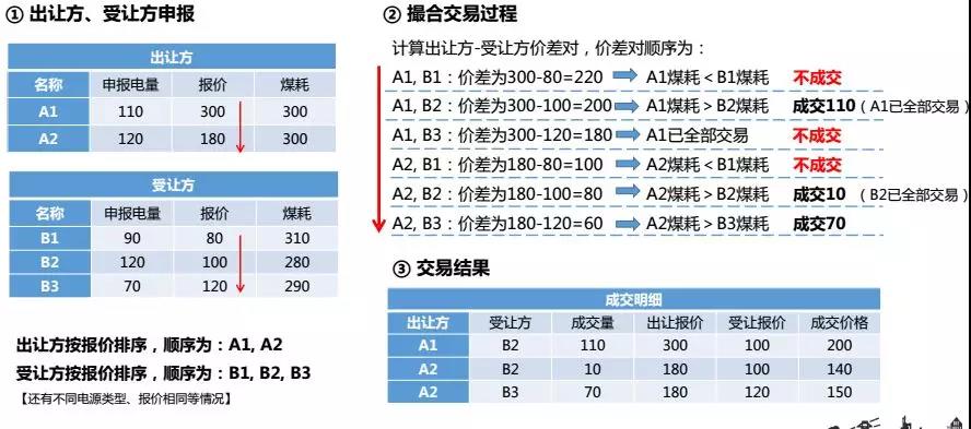 如下圖交易撮合過(guò)程所示,實(shí)際的發(fā)電合同電量轉(zhuǎn)讓高低匹配出清是在充分考慮節(jié)能減排原則的基礎(chǔ)上的出讓、受讓雙方的循環(huán)配對(duì)出清,而不是簡(jiǎn)單的集中競(jìng)價(jià)中的高低匹配出清。