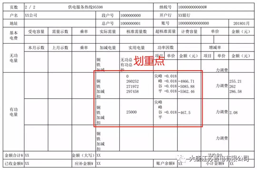 我們先來看第一頁,在紅框第一行第二列有4個數(shù)字,這就是抄表員為公司抄表所得到的用電量數(shù)字,單位為千瓦時,他們分別對應了峰時、平時、谷時的用電量,以及抄表電量。大家拿到核查聯(lián)后,要認真核對當月實際用電量,如果有問題要盡快向電力公司反饋。大家可能注意到,在紅框第二行,扣了25000千瓦時,這個電量,就是大家的非生產(chǎn)用電量了,它和峰平谷電量相加,就是當月的總用電量。