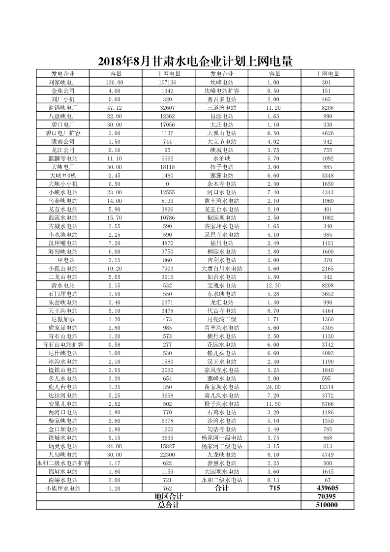 2.2018年8月甘肅水電企業(yè)計(jì)劃上網(wǎng)電量