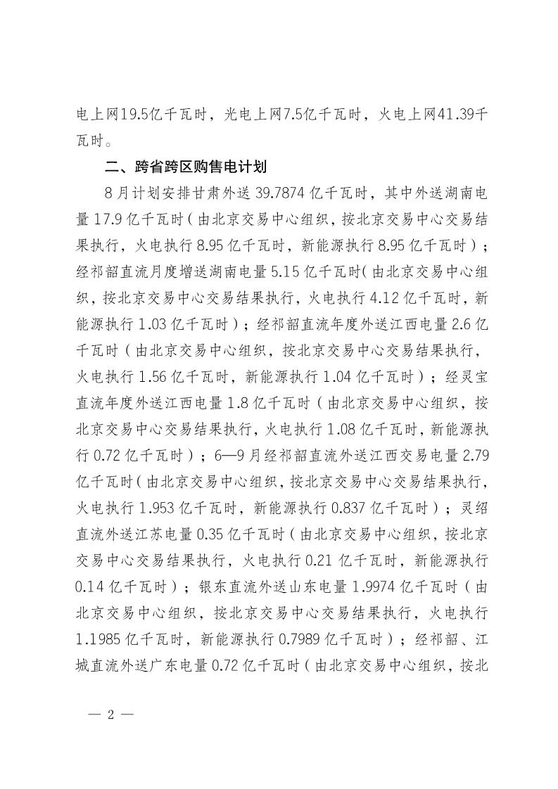 8月計(jì)劃安排甘肅外送39.7874億千瓦時(shí),其中外送湖南電量17.9億千瓦時(shí)(由北京交易中心組織,按北京交易中心交易結(jié)果執(zhí)行,火電執(zhí)行895億千瓦時(shí),新能源執(zhí)行8.95億千瓦時(shí));經(jīng)祁韶直流月度增送湖南電量5.15億千瓦時(shí)(由北京交易中心組織,按北京交易中心交易結(jié)果執(zhí)行,火電執(zhí)行4.12億千瓦時(shí),新能源執(zhí)行1.03億千瓦時(shí));經(jīng)祁部直流年度外送江西電量26億千瓦時(shí)(由北京交易中心組織,按北京交易中心交易結(jié)果執(zhí)行,火電執(zhí)行156億千瓦時(shí),新能源執(zhí)行1.04億千瓦時(shí));經(jīng)靈寶直流年度外送江西電量1.8億千瓦時(shí)(由北京交易中心組織,按北京交易中心交易結(jié)果執(zhí)行,火電執(zhí)行1.08億千瓦時(shí),新能源執(zhí)行0.72億千瓦時(shí));6-9月經(jīng)祁韶直流外送江西交易電量2.79億千瓦時(shí)(由北京交易中心組織,按北京交易中心交易結(jié)果執(zhí)行火電執(zhí)行1.953億千瓦時(shí),新能源執(zhí)行0.837億千瓦時(shí));靈紹直流外送江蘇電量0.35億千瓦時(shí)(由北京交易中心組織,按北京交易中心交易結(jié)果執(zhí)行,火電執(zhí)行0.21億千瓦時(shí),新能源執(zhí)行0.14億千瓦時(shí));銀東直流外送山東電量1.974億千瓦時(shí)(由北京交易中心組織,按北京交易中心交易結(jié)果執(zhí)行,火電執(zhí)行1.1985億千瓦時(shí),新能源執(zhí)行0.989億千瓦時(shí));經(jīng)祁韶、江城直流外送廣東電量0.72億千瓦時(shí)(由北京交易中心組織,按北京交易中心交易結(jié)果執(zhí)行,火電執(zhí)行04億千瓦時(shí),新能源執(zhí)行0.296億千瓦時(shí));月度外送映西電量6.48億千瓦時(shí)(火電執(zhí)行4536億千瓦時(shí);新能源執(zhí)行1.944億千瓦時(shí),按照月度申報(bào)出清結(jié)果執(zhí)行)。購(gòu)入網(wǎng)損電量0.33億千瓦時(shí);購(gòu)入李家峽電量1億千瓦時(shí)。全月全省聯(lián)絡(luò)線凈送出交易電量384574億千瓦時(shí)。