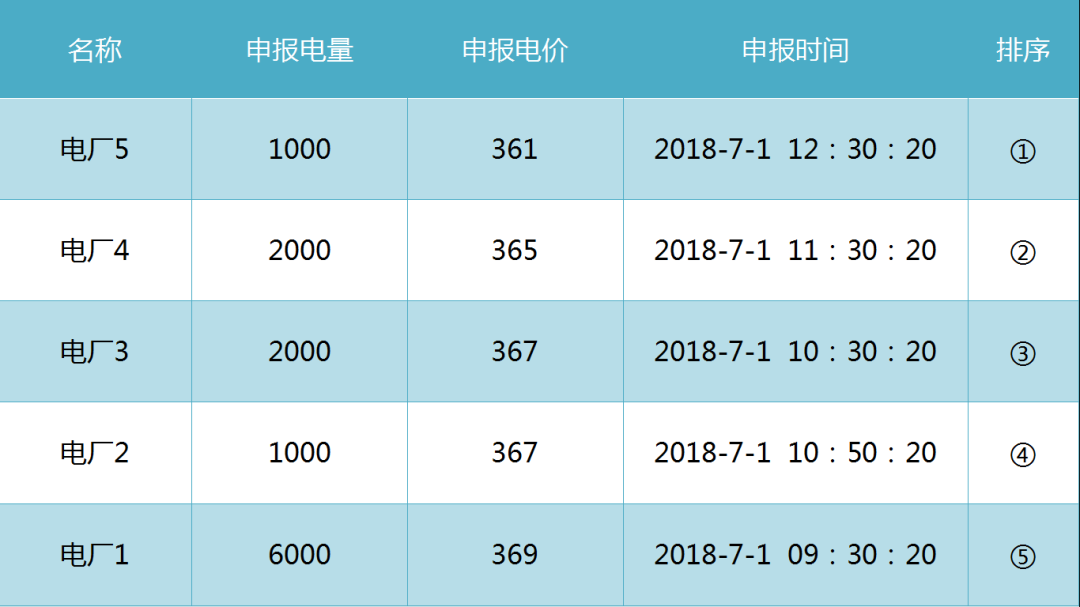 成交順序因素按電廠價(jià)格升序、容量降序、時(shí)間升序排列,電力用戶按價(jià)格降序、申報(bào)時(shí)間升序排列。