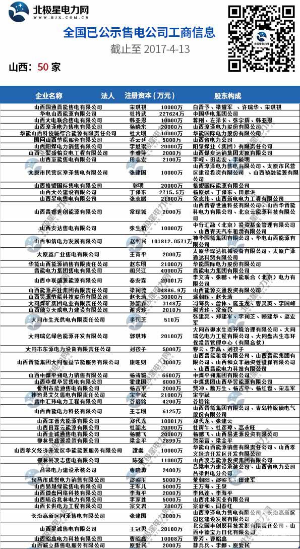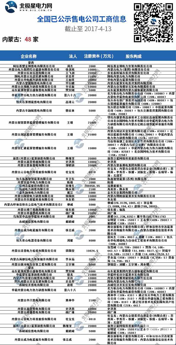 全國(guó)已公示1371家售電公司名單(截止2017-4-13)