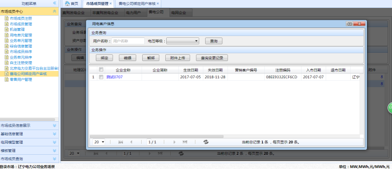 (4)用戶綁定受理已通過的可以在【市場成員中心】-【市場成員管理】-【售電公司】中可以查看到該售電公司綁定成功的用戶。