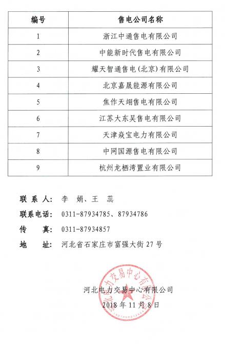 河北電力交易中心今日發(fā)布了《關(guān)于公示受理注冊(cè)的售電公司相關(guān)信息的公告(注冊(cè)-2018-052)》,公示北京推送的9家售電公司,公示期為2018年11月8日至12月7日,時(shí)間一個(gè)月。
