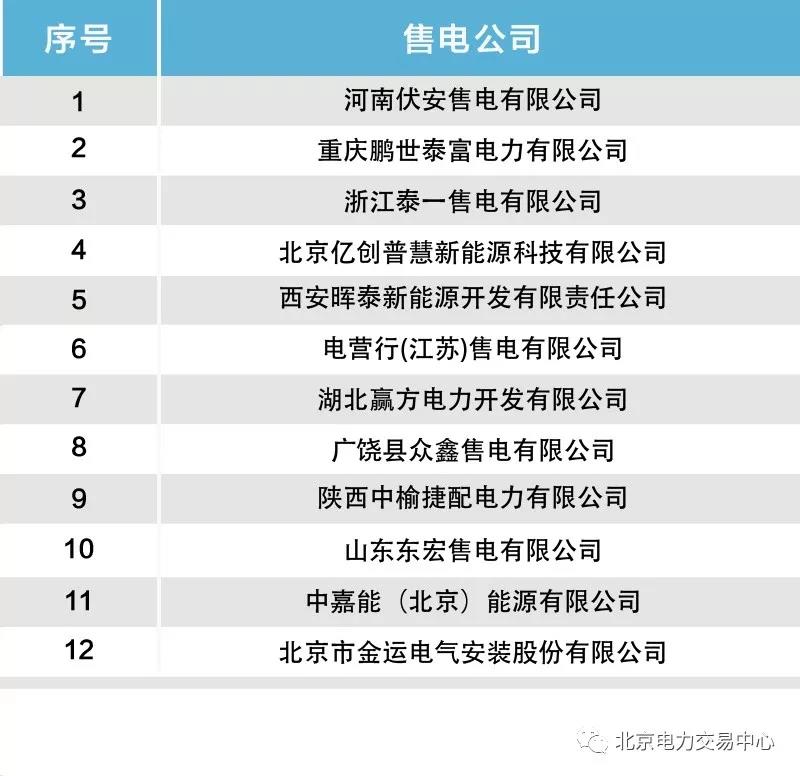 11月9日,北京電力交易中心發(fā)布了售電公司公示結果公告。按照國家發(fā)展改革委、國家能源局《售電公司準入與退出管理辦法》有關規(guī)定,河南伏安售電有限公司等12家售電公司公示無異議,在北京電力交易中心的注冊自動生效。