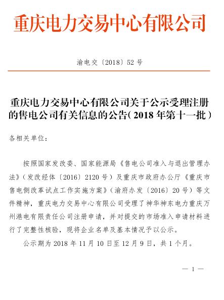 重慶電力交易中心日前發(fā)布了《關于公示受理注冊的售電公司有關信息的公告(2018年第十一批)》,公示1家售電公司,公示期為2018年11月10日至12月9日,共一個月。