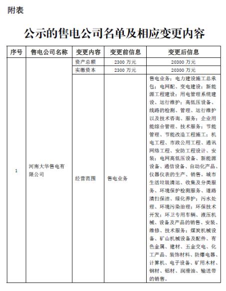 河南公示河南大華售電有限公司的注冊(cè)信息變更申請(qǐng)