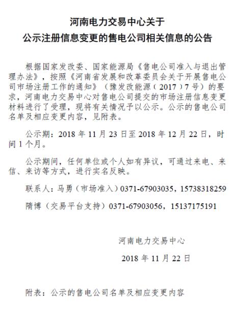 河南電力交易中心日前發(fā)布了《關(guān)于公示注冊(cè)信息變更的售電公司相關(guān)信息的公告》,公示河南大華售電有限公司的注冊(cè)信息變更申請(qǐng),公示期為2018年11月23日至12月22日,時(shí)間一個(gè)月。